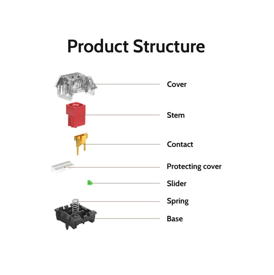 The new Box V2 switch features a POM stem, black translucent cover, and solid black base with a 5-Pin positioning column. The LED slot’s cover is half-sealed to assure more light can be transmitted. There are 2 small openings on the LED slot to make it compatible with the 2-Pin LED and SMD-LED. Additionally, compared to the V1, the Box V2 switch also has some differences in its typing feel. Instead of the V1's traditional tactile, the Box V2 brown switch has a heavier and stronger tactile response and is more advanced than the V1. The Box V2 red switch also offers a more even and smooth feel than the V1.